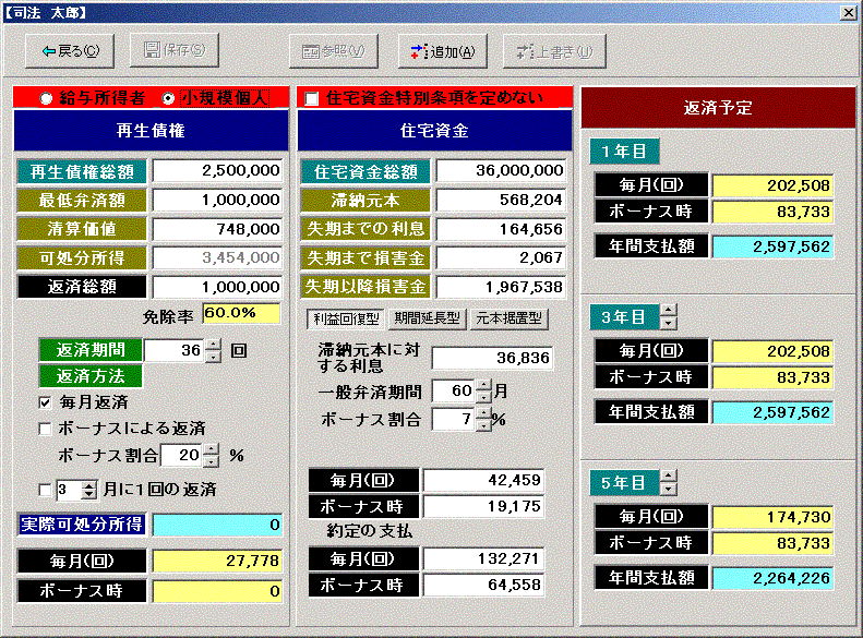 入力された情報をもとに、「最低弁済額」「清算価値」「可処分所得」から、給与所得者再生手続・小規模個人再生手続を行うとした場合の返済総額を算出し、住宅資金特別条項を選択した場合としなかった場合の再生債権の金額より、返済期間のシミュレーション及び住宅資金の返済シミュレーションを行い、返済可能性を模索します。