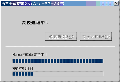 上記画面で間違って[キャンセル]ボタン(又は閉じるボタン)を押下した場合、変換処理は実行されません。再生手続支援システムは新規作成のみが可能の状態で起動されます。その場合には「データのバックアップ&復元」で旧データベースの復元を行えば変換処理ができます。またデータベース変換プログラム(SaiConvP.exe)を直接実行することでも再コンバートが可能です。 (「Ver7.1以降で旧バックアップデータを復元する手順について」を参照願います。)