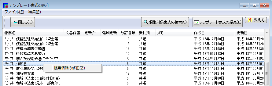 ⑤目的の帳票を右クリックし、[帳票情報の修正]画面を