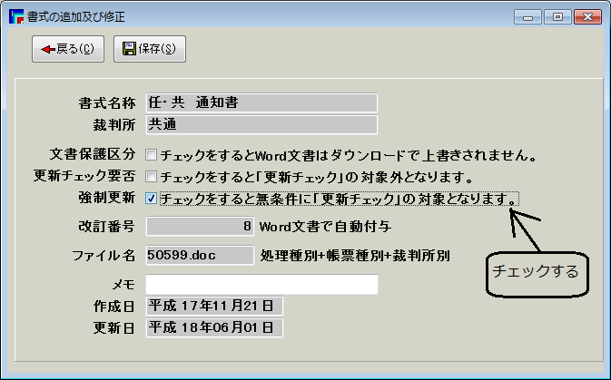 ⑥ ②の操作を行うと[強制更新]対象の文書も表示され