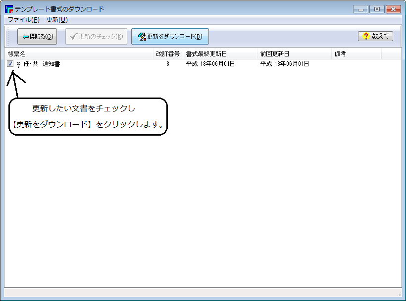ますので更新したい文書をチェックして[ダウンロード]して下