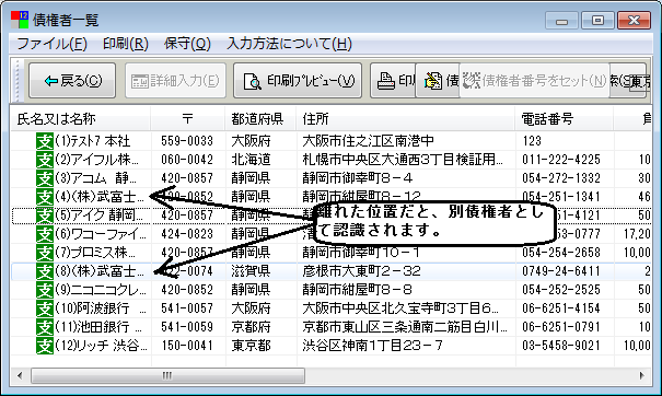 | 申立人の債権者入力の順番の関係で、債権者一覧表中の並び位置が離れていたりすると別個の債権者として扱われます。 |