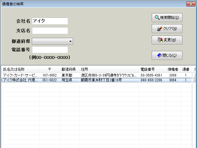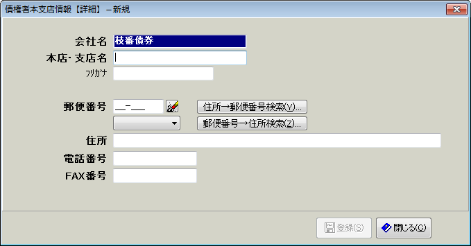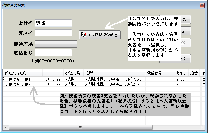 ユーザー登録時に、「会社」+「支店」で登録されていない場合、連続していても債権者コードが違うため同一債権者にはなりません。 例:9001-1と9002-1は債権者コードが違うため同一債権者番号にはなりません。
