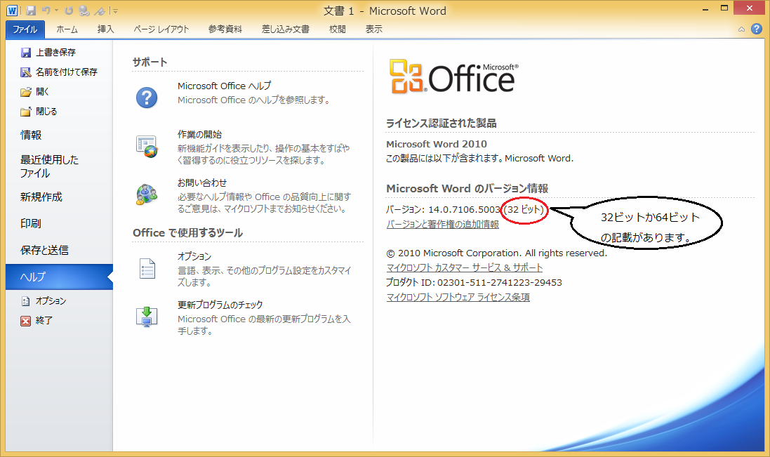 @ 【ファイル】タブをクリックします。 A 左の【ヘルプ】をクリックするとバージョン情報が表示されます。 Windowsが64bit版であってもWord(Office)が32bit版であれば問題ありません。 |