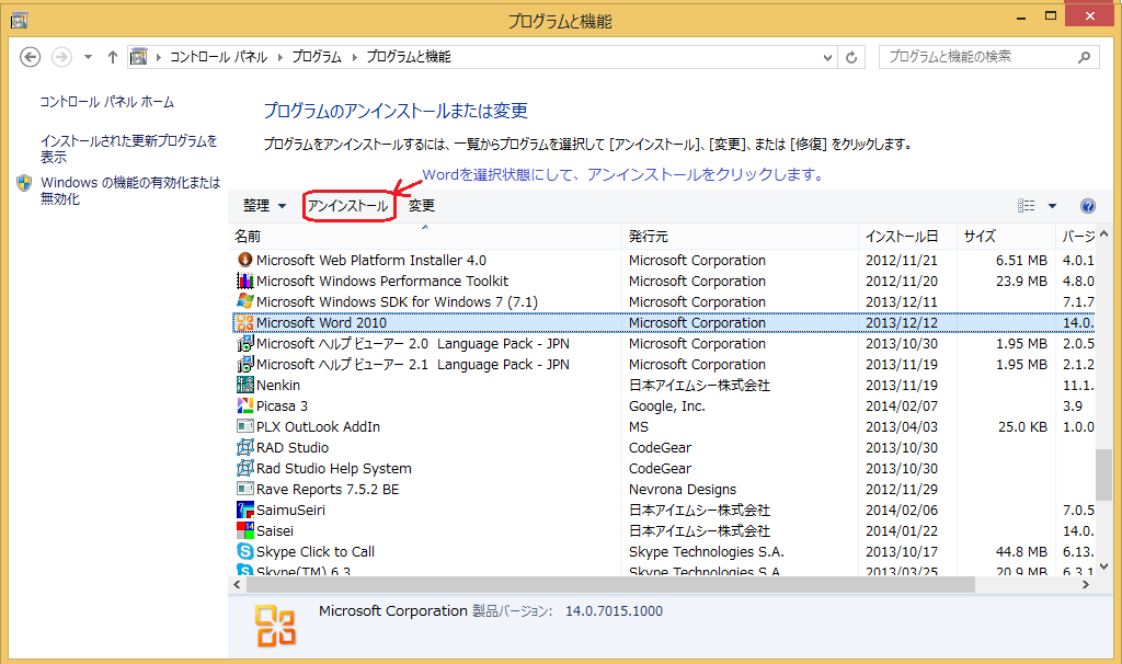 MicrosoftOffice 又は、Microsoft Wordを選択し、【アンインストール】をクリックします。 |
