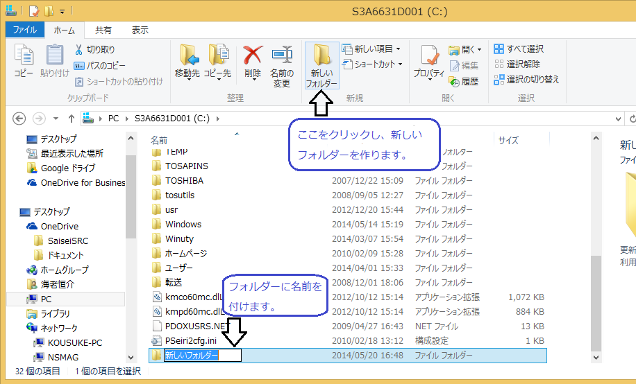@ データベースフォルダを作りたいフォルダに移動し、【新しいフォルダー】をクリックします。