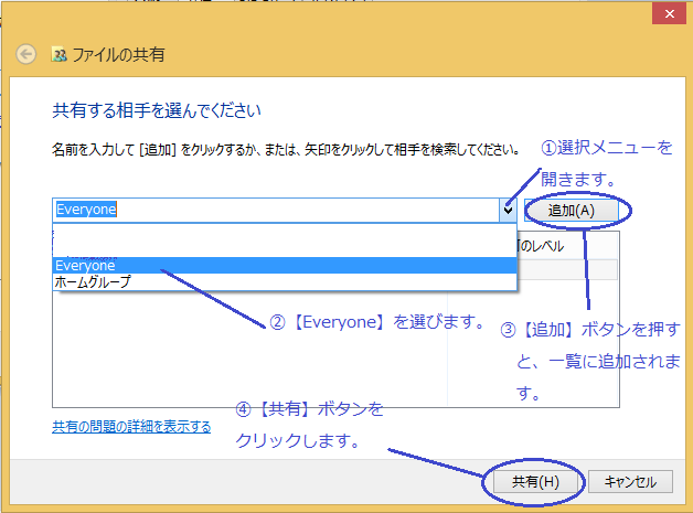 C 一覧のEveryoneを選択し、アクセス許可のレベルを読み取り/書き込みにします。 D 右下の【共有】ボタンをクリックします。