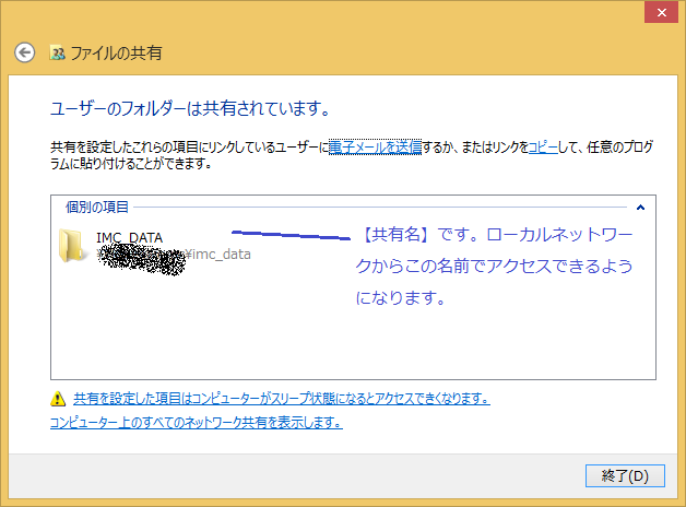 表示された共有名で、ネットワークからアクセスできるようになります。