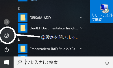 画面右下のWindowsマークをクリックし、「設定」(歯車のアイコン)を開きます。