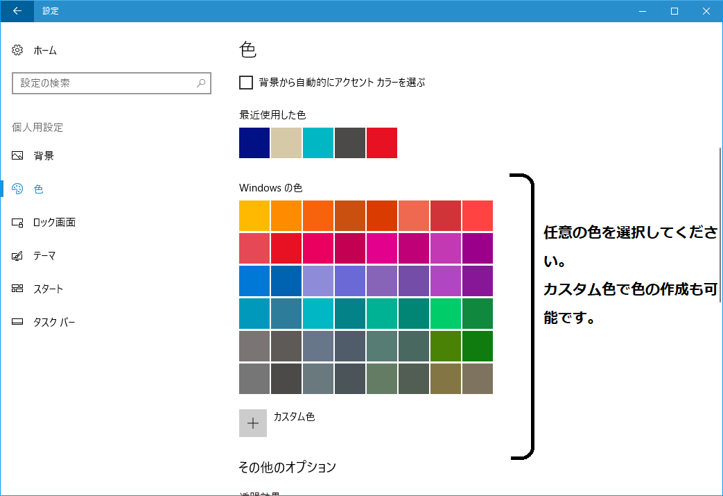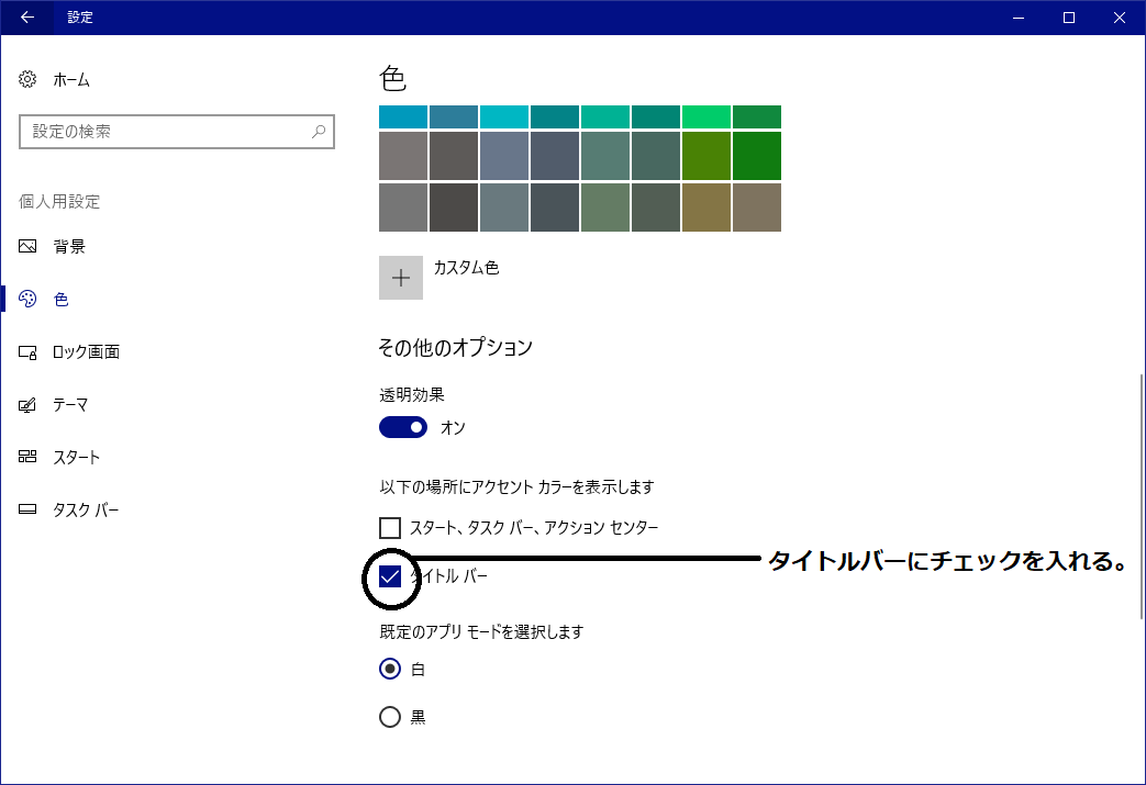 Windows10では以下の方法でタイトルバーに任意の色を設定できます。下記の手順を行って下さい。